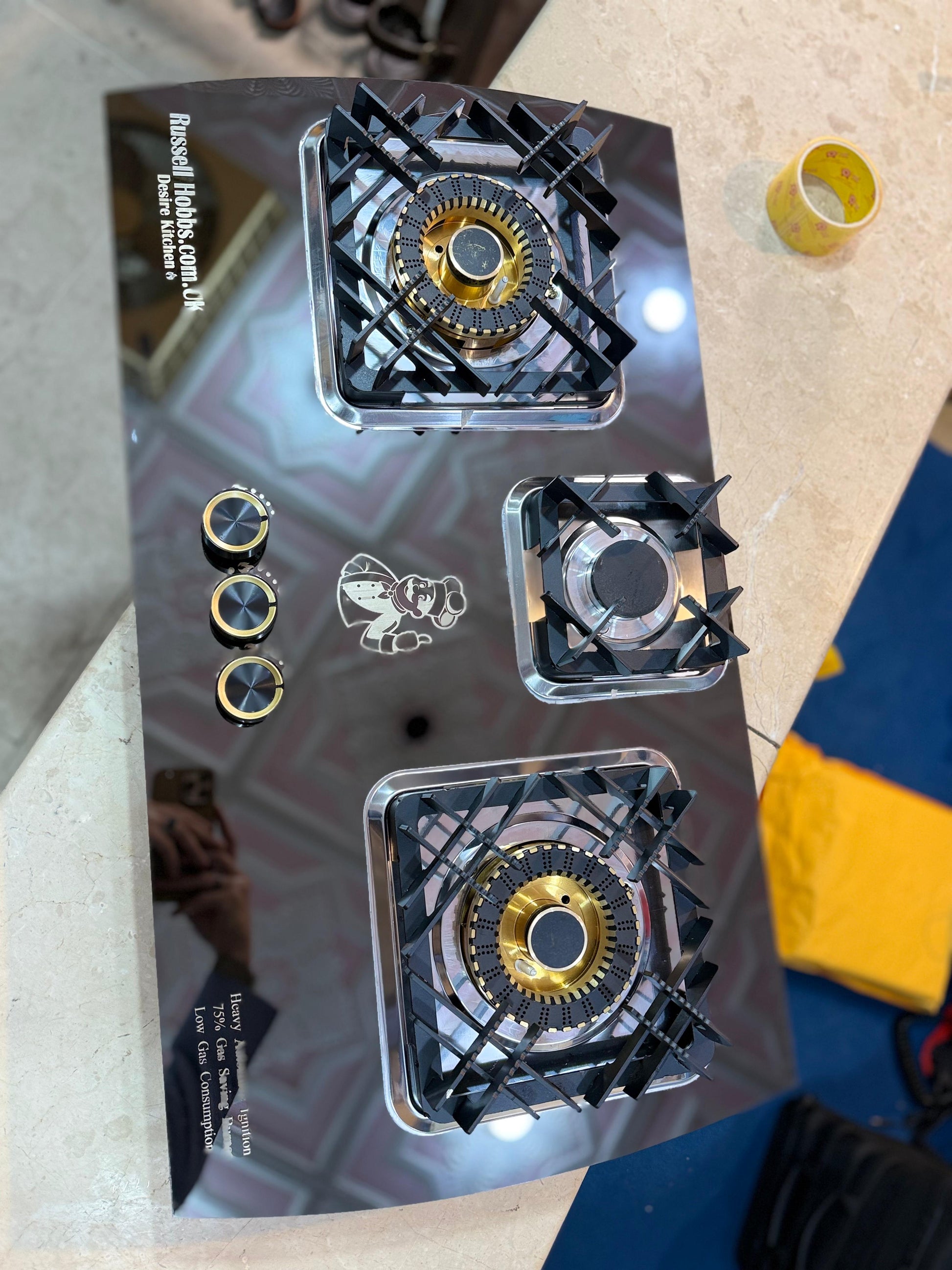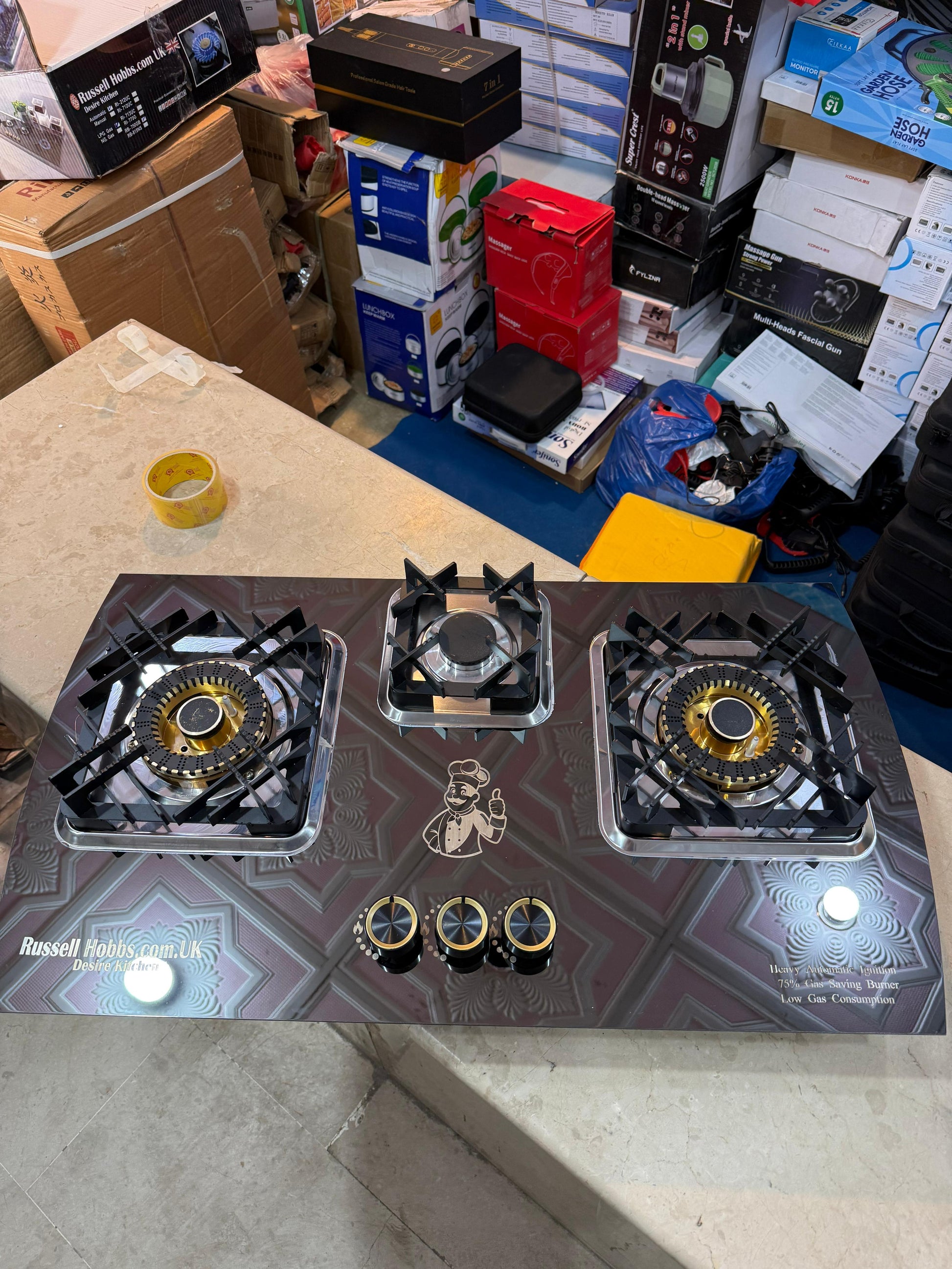 The **Russell Hobbs 3-Burner Stainless Steel Gas Stove** (commonly found in South Asian and Middle Eastern markets as a countertop model) is designed to balance modern aesthetics with heavy-duty performance. It features a sleek, rust-resistant body paired with high-efficiency burners for varied cooking needs.